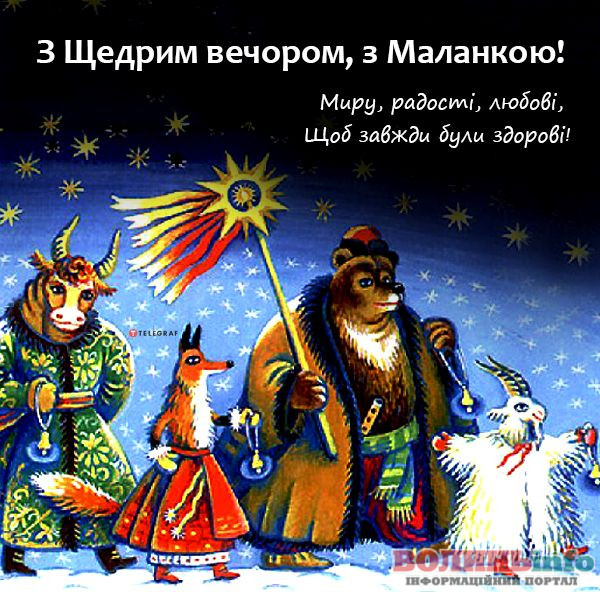 Щедрий вечір, добрий вечір! Добрим людям на здоров’я! Вітаю вас та вашу родину зі Щедрим вечором та Меланкою! Нехай у вашій родині панують мир та злагода, діточки ростуть здоровими, а щастя і добробут не лишають ваш дім! Веселих свят та чистих думок!