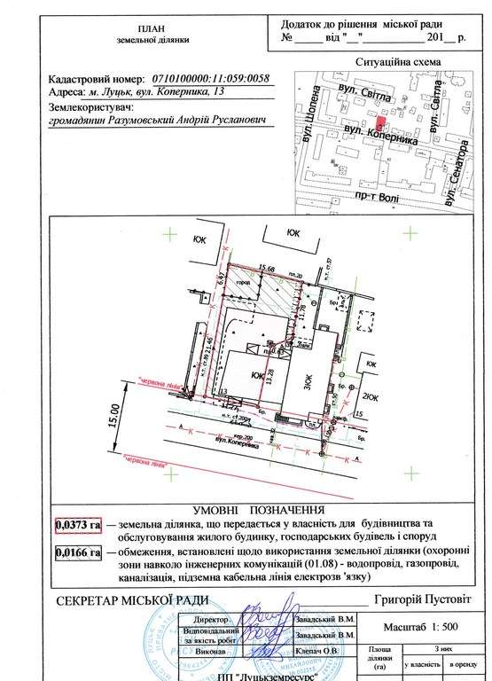 Андрій Разумовський звернувся до міськради щодо передачі безоплатно у власність земельної ділянки на вул. Коперника, 13 для будівництва та обслуговування житлового будинку, господарських будівель і споруд площею 0,0373 га, кадастровим номером 0710100000:11:059:0058.