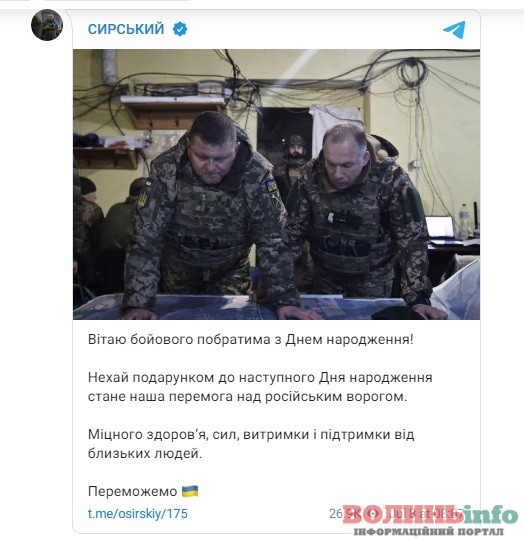 Командувач Сухопутних військ ЗСУ Олександр Сирський побажава генералу якнайшвидшої перемоги над ворогом.