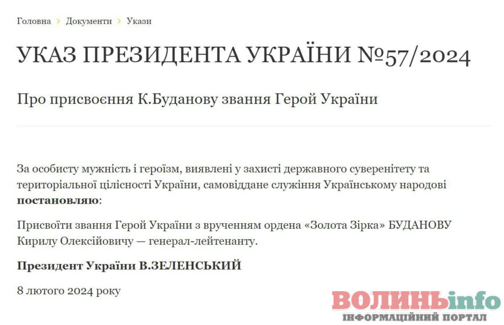 На офіційному веб-сайті президента України Володимира Зеленського з’явився указ про присвоєння звання Героя України двом видатним особистостям – Залужному та начальнику ГУР Міністерства оборони Кирилу Буданову.