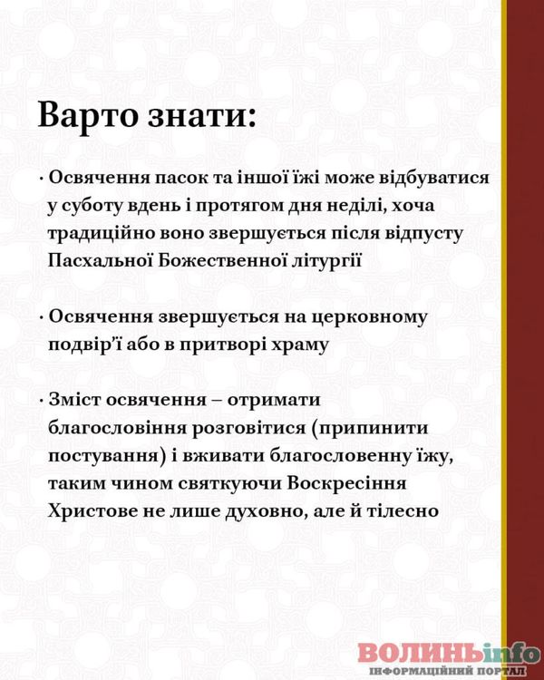 Пам’ятайте, що великодні кошики з паскою – це символ любові до ближніх, і ми складаємо святковий кошик, найперше, щоби розділити його з ближніми. Якщо у вас є можливість – допоможіть воїнам і переселенцям, самотнім і нужденним не залишитись без святкової трапези, поділіться з ними великодньою радістю, долучившись до різноманітних соціальних ініціатив, благодійності, волонтерства. Це стане доброю можливістю для правдивого служіння, адже милостивий Господь завжди спiшить допомагати нужденним, зокрема, і через кожного з нас.