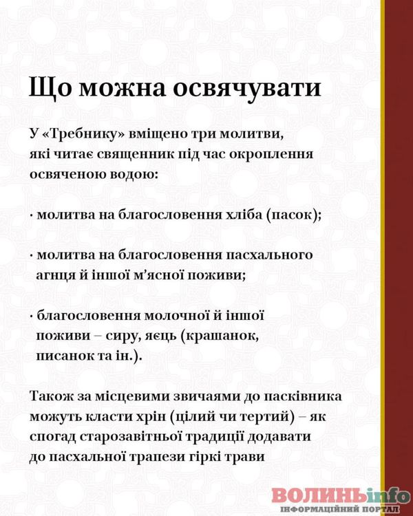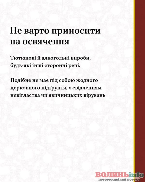 Не варто влаштовувати змагання щодо того, у кого більший чи дорожчий кошик, не варто накладати у нього повну гору харчів, освячувати якісь екзотичні продукти чи «спеціальні» прилади для пасхальної трапези.